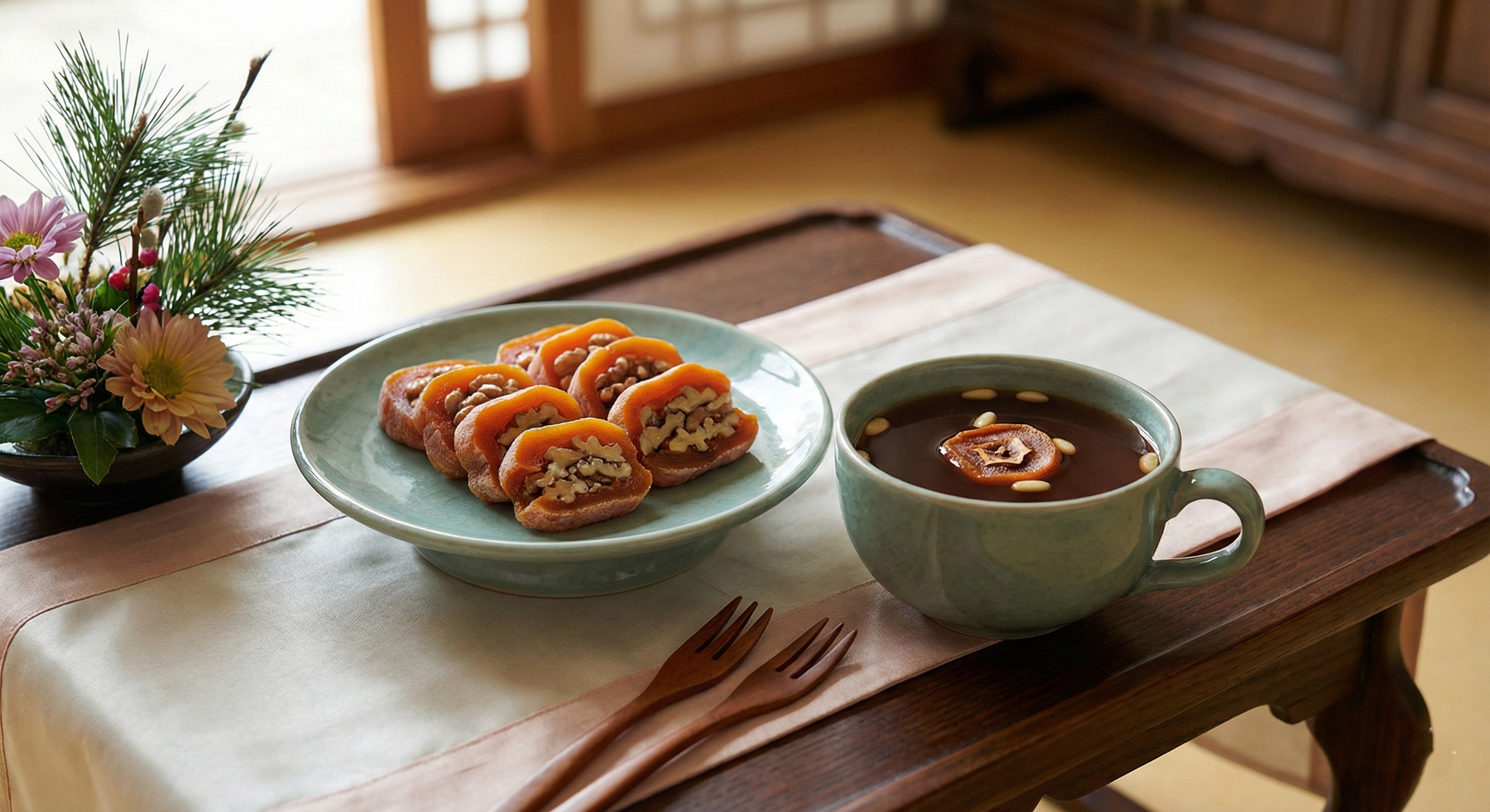 곶감의 씨를 빼고 넓게 펼친 뒤, 호두를 넣고 김밥처럼 돌돌 말아 썰어주세요. 고소함과 달콤함의 조화가 일품입니다.