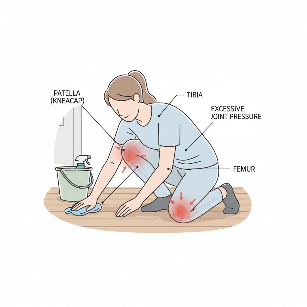 무릎을 자주 꿇고 걸레질을 하거나 쪼그려 앉는 습관이 있다면 '점액낭염'을 주의해야 합니다. 관절을 감싸고 있는 주머니(점액낭)에 염증이 생겨 붓고 열감이 느껴지는 것이 특징입니다.